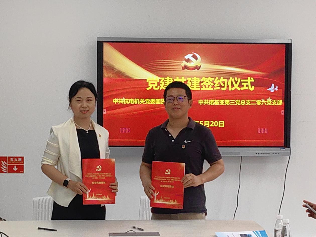 在全体与会党员代表的见证下,国资实验党支部书记樊冰与诺基亚第三党总支二零六党支部书记林先茂共同签署《党建共建合作协议》。